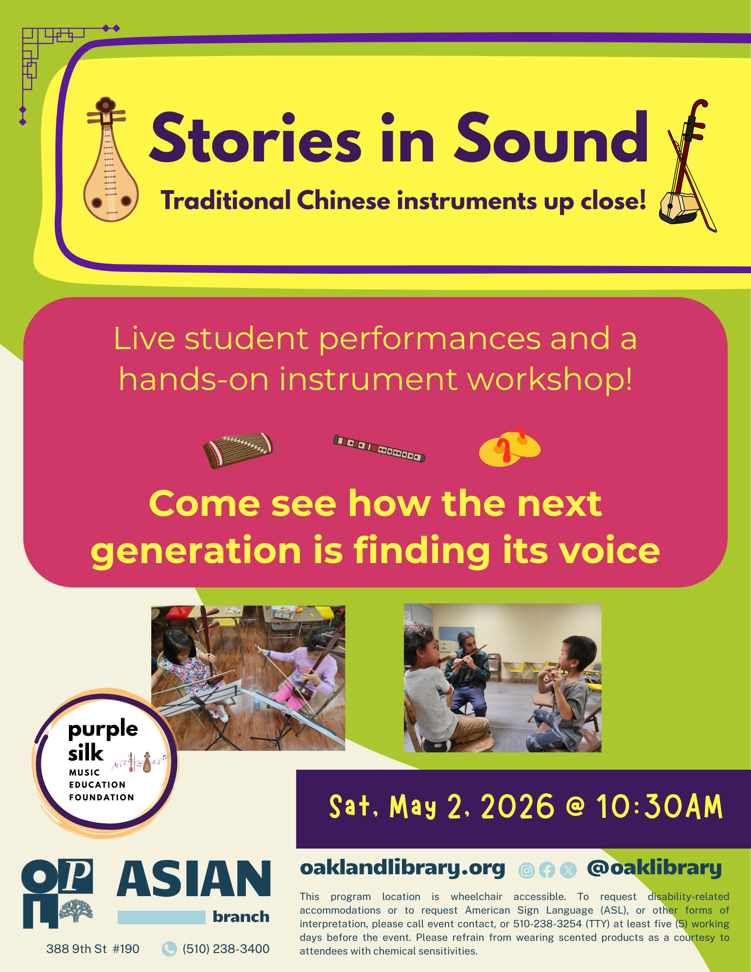 Join us for Stories in Sound, a vibrant community event at the Oakland Public Library in the heart of Oakland Chinatown. This special program brings together storytelling, music, and cultural exploration in an engaging and family-friendly setting.